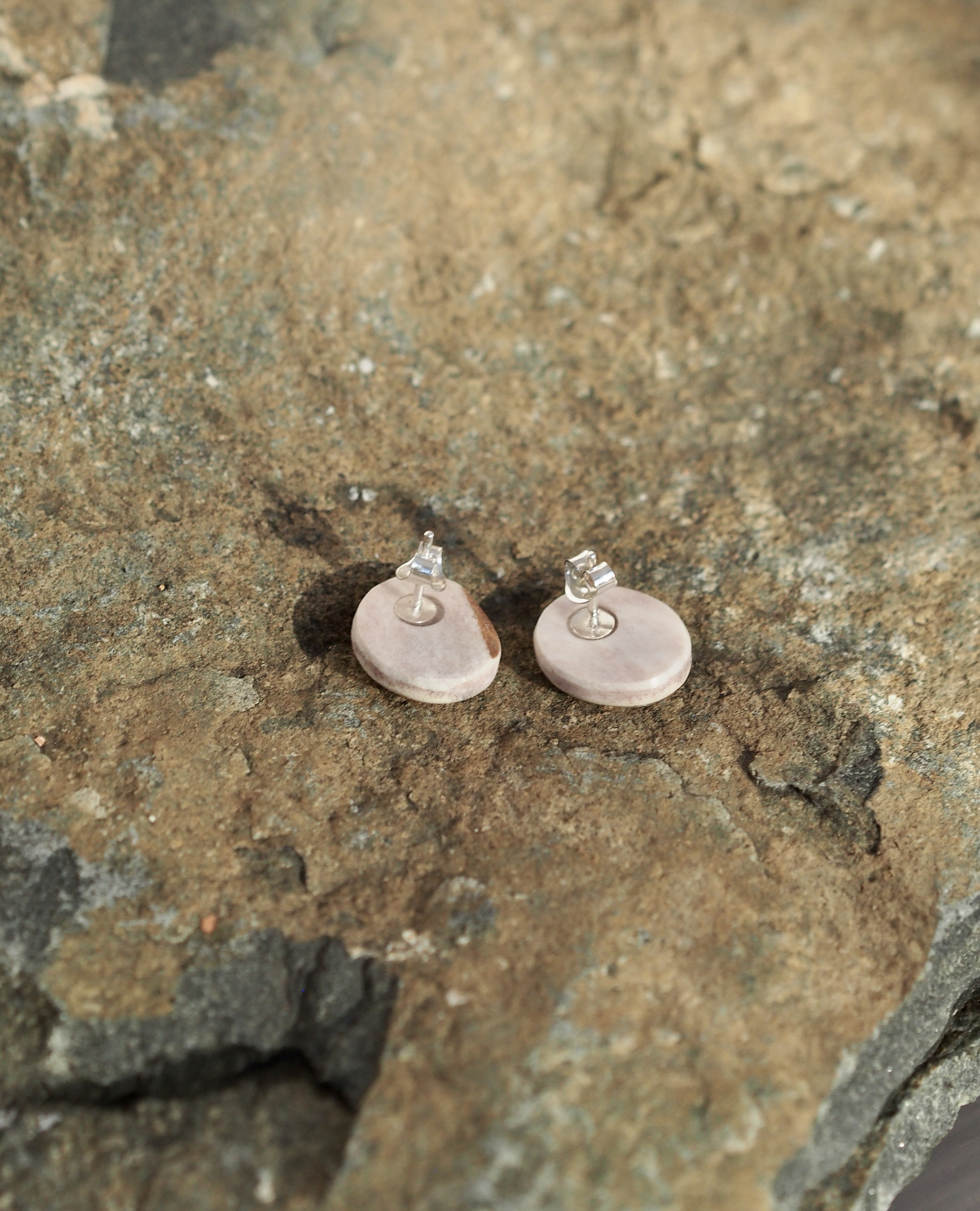 Poronsarvesta ja luonnonkukista valmistetut nappikorvakorut hopeaosilla.