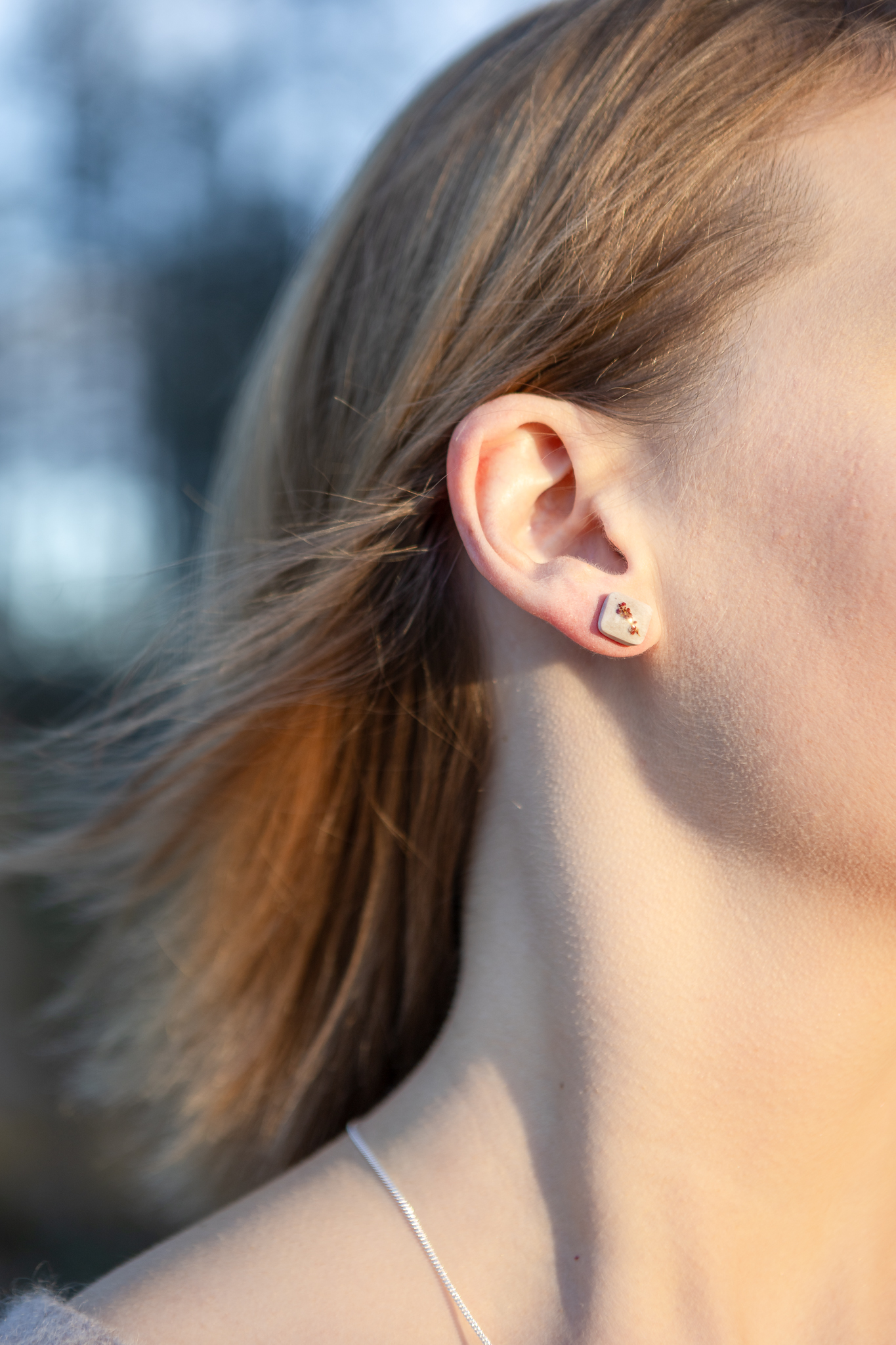 Rouku on pieni neliskanttinen korvakoru, joka toimii yhtä hyvin herkkänä juhla-asusteena, kuin päivittäisenä luottokorvakoruna. Koristeena tässä korussa aito sodankylästä poimittu suolaheinän kukinto. Korvakorun koko noin 10x10mm.